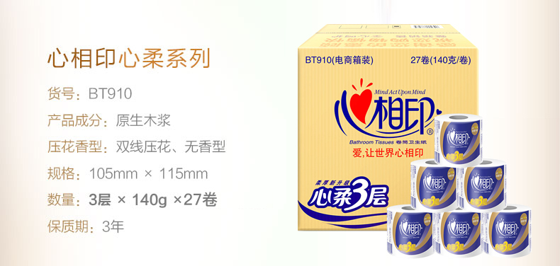 - 心相印卷纸BT810卫生纸三层卷筒纸厕纸巾心柔大卷纸180g整箱27卷