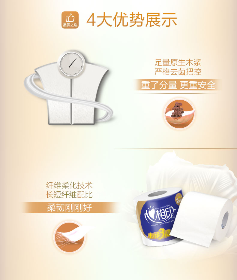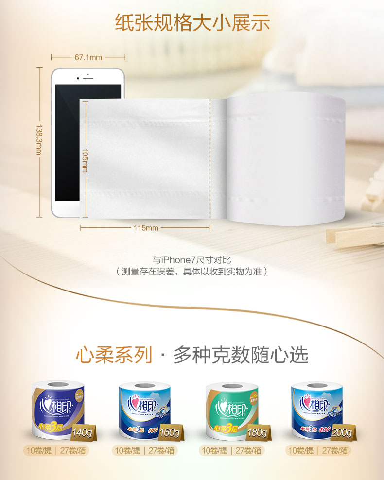 - 心相印卷纸卫生纸BT1610 柔肤系列婴儿用纸180克27粒装三层