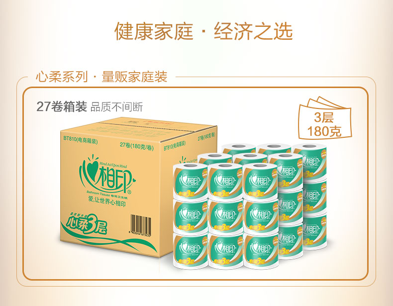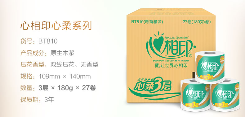 - 心相印卷纸BT810卫生纸三层卷筒纸厕纸巾心柔大卷纸180g整箱27卷